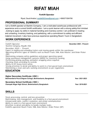 I am a dedicated and skilled forklift operator with strong experience in warehouse operations, stock processing, inventory control, and loss prevention. I am efficient in multitasking, time management, and adapting to fast-paced work environments.